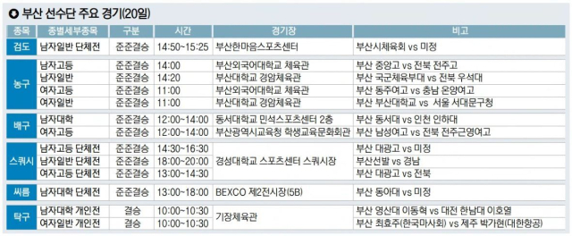 테니스 고등부 부산선발팀은 8강에서 강원도 양구고에 0-3으로 졌다. 여자대학부 부산선발팀도 8강에서 서울선발팀에 0-2로 패했다. 부산고도 야구 고등부 8강에서 대전고에 1-3으로 져 발걸음을 돌렸다.