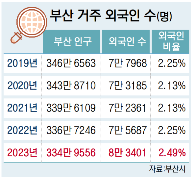 3일 부산시에 따르면 부산의 외국인 주민 수는 8만 3401명으로 부산 인구수(334만명) 대비 2.49%가 부산에 거주 중이다. 2021년 7만 2361명이었던 외국인 주민 수는 2022년 7만 5687명을 기록하고 2023년에는 8만 명을 넘어섰다. 부산 인구수는 지속해서 감소하고 있으나 외국인 주민 수는 매년 약 4~10%의 증가세를 보이고 있다.