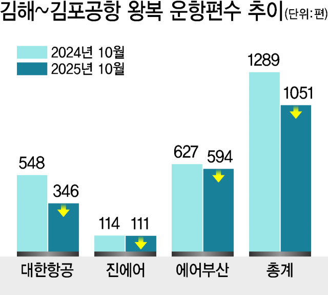 특히 대한항공의 항공편 감소가 두드러지게 나타났다. 지난해 10월 548편이었던 김해~김포공항 왕복 항공편은 1년 만에 346편으로 약 36% 감소했다. 같은 기간 에어부산의 김해~김포공항 왕복 항공편은 33편 감소했다.