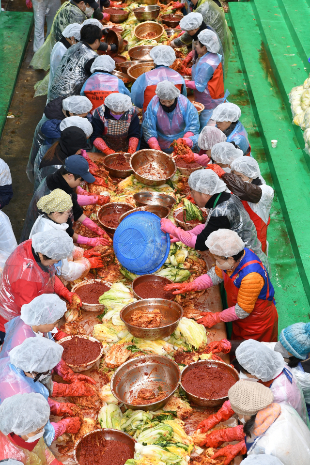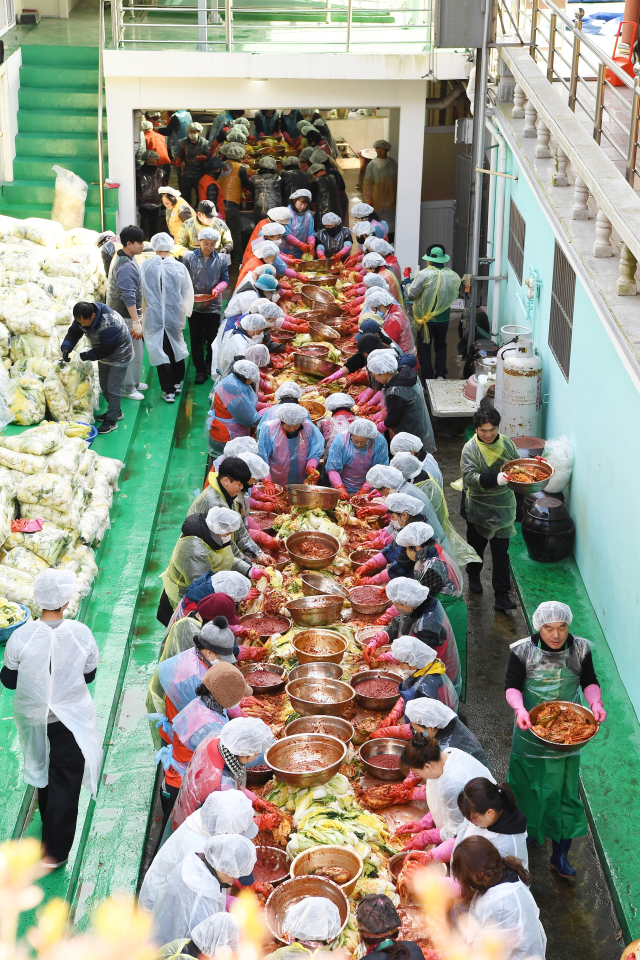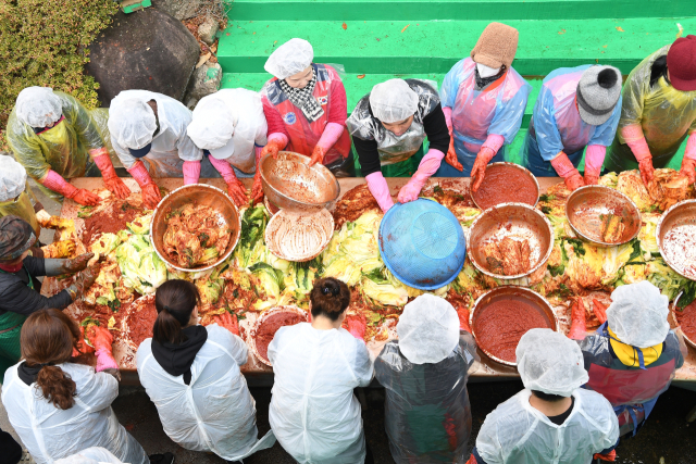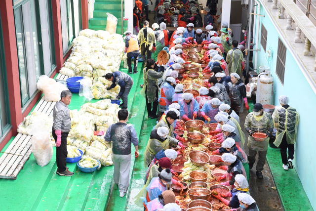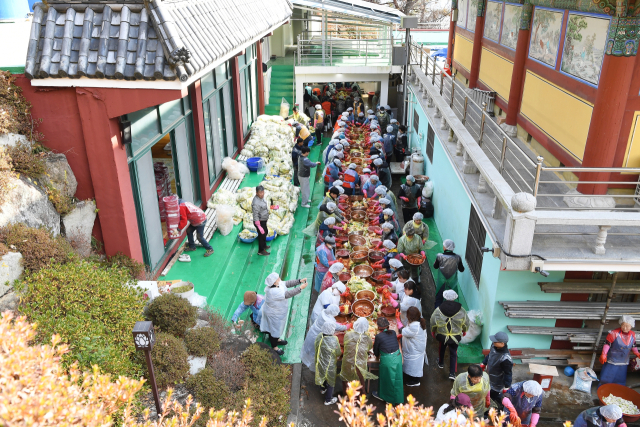 14일 부산 동래구 효자암에서 ‘1만 포기 김장김치 담그기’ 행사가 열려 자원봉사자 150여 명이 저소득취약계층, 장애인단체, 무료급식소에 전달될 김치를 담그고 있다. 동래구청 제공