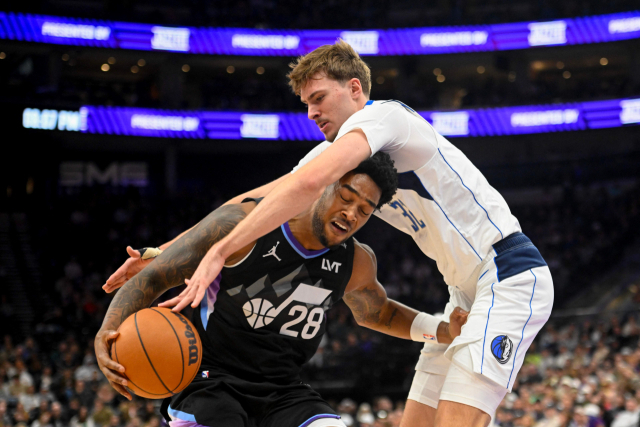 미국프로농구(NBA) 댈러스 매버릭스의 쿠퍼 플래그(오른쪽)가 16일(한국 시간) 미국 유타주에서 열린 경기에서 유타 재즈의 브라이스 센서보의 돌파를 막고 있다. 이날 42점을 기록한 쿠퍼 플래그는 18세 선수로는 최초로 한 경기 40점대 득점을 기록했다. AFP연합뉴스