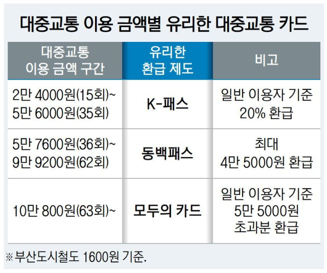 내년부터 새롭게 도입되는 ‘모두의 카드’가 부산 시민들 대중교통 카드 이용 셈법을 바꿀 것이라는 전망이 나온다. 환급 상한이 없는 모두의 카드가 출시되면서 대중교통 이용 패턴에 따라 교통비를 아낄 새로운 방법이 생겼기 때문이다.