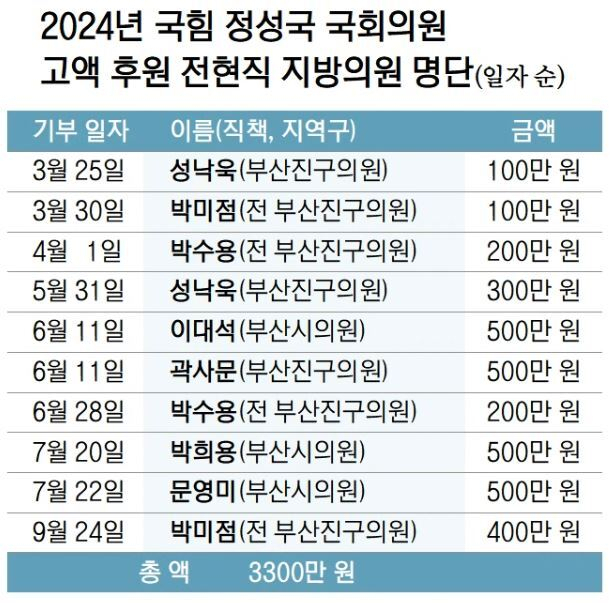지방의원들의 고액 후원은 광역의원들보다 연봉이 적은 기초의원들도 예외는 아니었다. 22대 총선을 보름 앞둔 3월 25일 성낙욱 부산진구의원은 선거 결과가 나오기도 전 선제적으로 100만 원을 후원했다. 이어 정 의원의 국회의원 임기가 시작된 다음 날인 5월 31일 추가로 300만 원을 후원회 계좌에 입금했다.