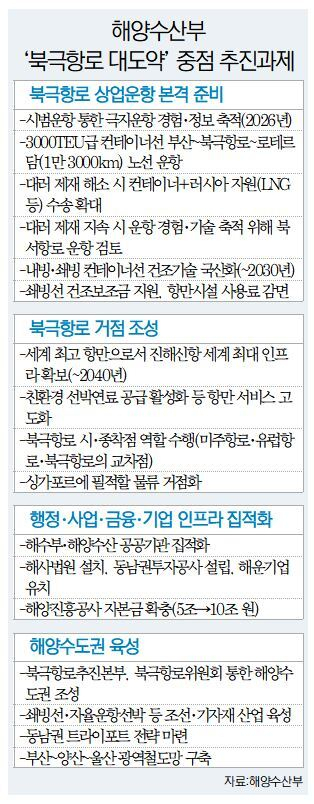 해수부는 내년부터 북극항로 상업운항을 위한 준비를 본격적으로 시작한다. 내년 여름 3000TEU급(1TEU는 20피트 길이 컨테이너 1개분) 컨테이너선을 부산에서 로테르담까지 시범 운항하고, 내빙과 쇄빙 기능을 갖춘 컨테이너선 건조기술 국산화와 함께 인센티브 제공 등 체계적인 선사지원 체계를 마련할 방침이다.