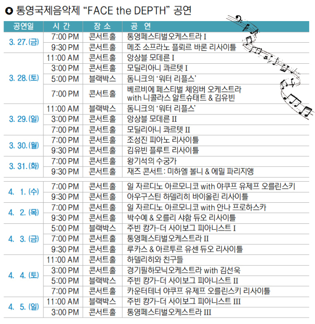 ‘깊이를 마주하다’(FACE the DEPTH)를 주제로 오는 3월 27일부터 4월 5일까지 통영국제음악당에서 열리는 2026 통영국제음악제에서는 총 26개의 공식 공연이 열린다.