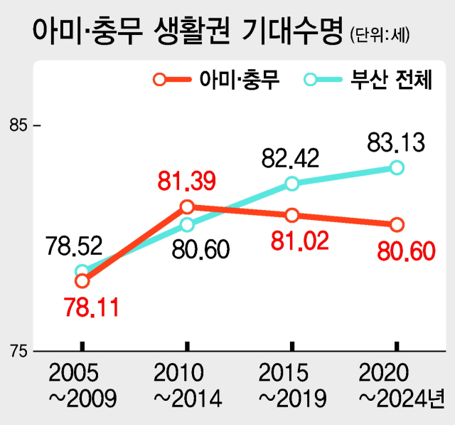 분석 결과, 아미충무 생활권은 10여 년에 걸쳐 기대수명이 계속해서 감소한 유일한 생활권이다. 2010~2014년 81.39세였던 기대수명은 조금씩 하락을 거듭하다 2020~2024년 80.60세를 기록했다. 10년간 매일 2시간씩 수명이 깎인 셈이다.