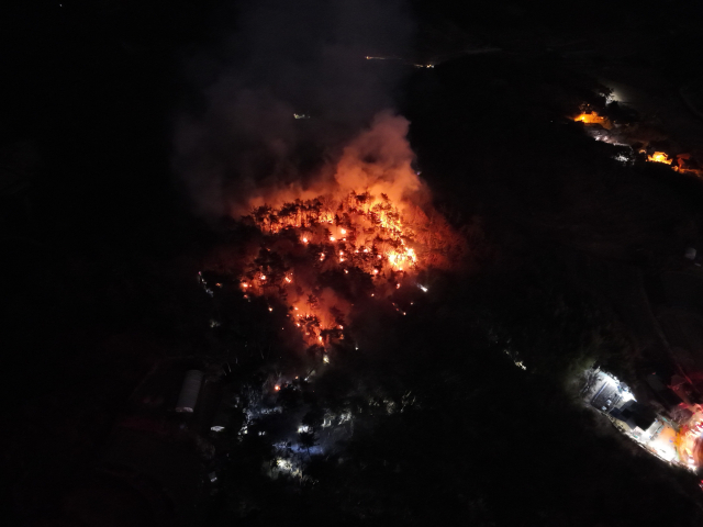 22일 오전 3시 44분 울산 중구 성안동 일대에서 산불이 났지만 3시간 30여 분 만에 진화됐다. 소방당국은 헬기 2대, 차량 38대, 인력 107명을 투입해 이날 오전 7시 15분께 큰 불길을 잡았다. 울산소방본부 제공