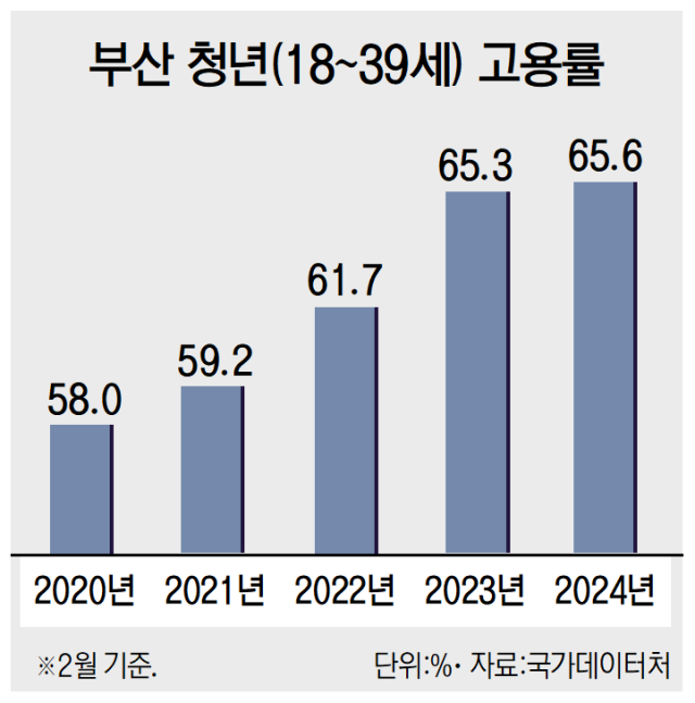 부산 청년의 고용률과 자가 점유율도 높아졌다. 국가데이터처 통계에 따르면 부산 청년(18~39세) 고용률은 2020년 58.0%에서 2024년 65.6%로 7.6%P 상승해 증가 폭이 전국 평균(5.9%P)은 물론 8대 특별·광역시 중에서도 가장 컸다.