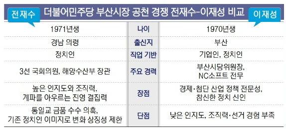 민주당은 인지도와 조직력에서 우위로 평가 받는 전 의원과 참신함을 앞세운 이재성 전 부산시당위원장이 맞붙는 구도가 형성됐다. 이에 앞서 국민의힘은 3선 연임에 도전하는 박형준 시장과 세대 교체를 내건 주진우 의원(해운대갑)이 본선 티켓을 놓고 내부 경쟁에 돌입했다.
