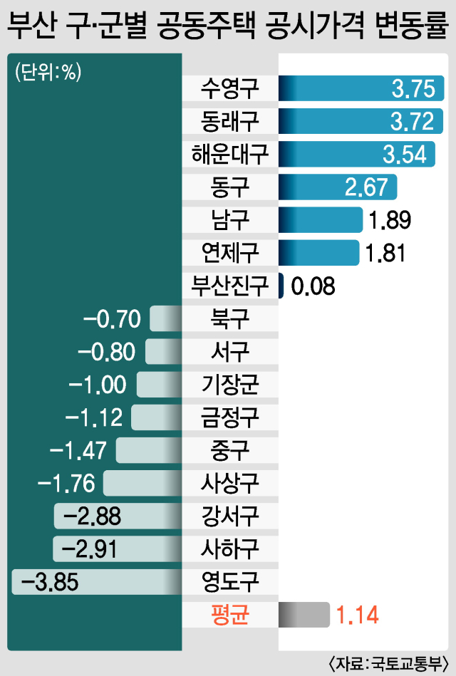 올해 부산의 공동주택(아파트·연립·다세대) 공시가격이 1.14% 오른 것으로 나타났다. 다만 구군별로 차이가 커서 이른바 ‘해수동’은 3%대 상승률을 나타냈고 일부 지역은 마이너스였다.