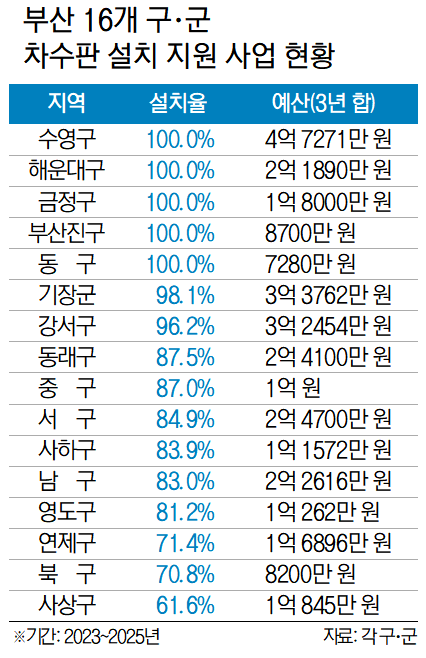 전체 설치율은 높지만 지역별 격차가 컸다. 수영구(322건)와 금정구(98건), 동구(42건), 부산진구(53건)는 설치율이 100%로 나타났다. 해운대구 역시 100%(65건)를 기록했다. 해운대구는 2022년에 차수판 신청 대기 중이던 22곳까지 2023년에 모두 설치하기도 했다.