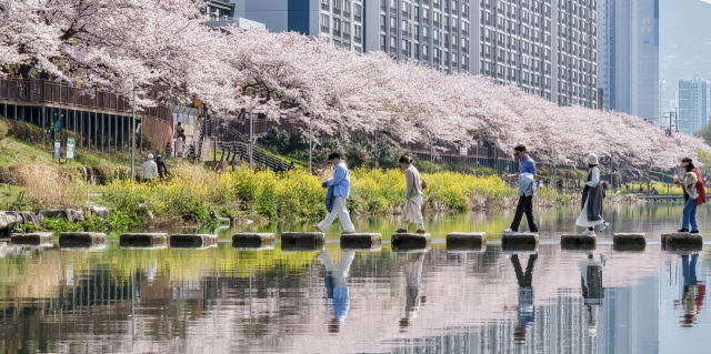 휴일인 5일 오후 부산 지역 낮 최고기온이 18도까지 올라가는 완연한 봄 날씨를 보였다. 이날 벚꽃과 유채꽃이 활짝 핀 연제구 온천천에 나온 시민들이 징검다리를 건너고 있다.