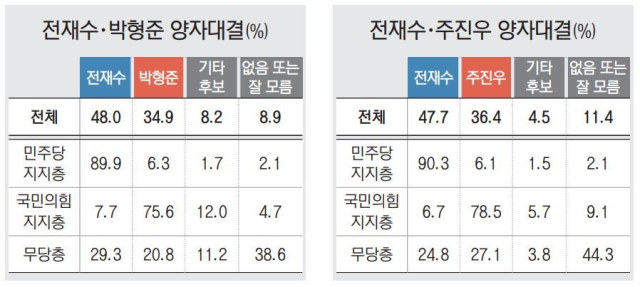 전 의원과 주 의원의 양자대결에서는 전 의원(47.7%)이 주 의원(36.4%)을 11.3%P로 앞서며 박 시장과 마찬가지로 오차범위 밖에서 지지율 격차를 형성했다. 민주당 지지층의 90.3%가 전 의원을 지지했고, 국민의힘 지지층 78.5%가 주 의원을 지지했다.