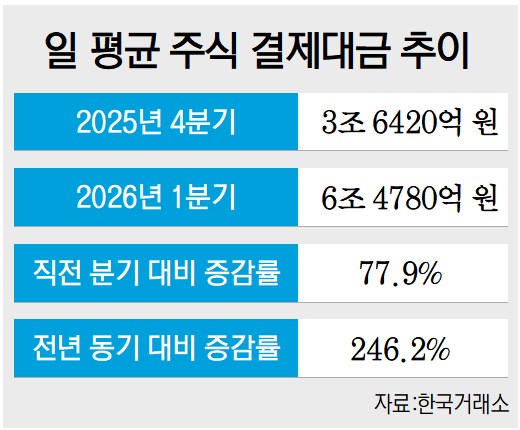 한국예탁결제원은 13일 ‘2026년 1분기 증권결제대금 현황’을 통해 올해 1분기 일평균 증권결제대금이 35조 8000억 원으로 집계됐다고 밝혔다. 이는 직전 분기(31조 1000억 원) 대비 15.3%, 전년 동기(27조 2000억 원) 대비 31.6% 증가한 수치다.