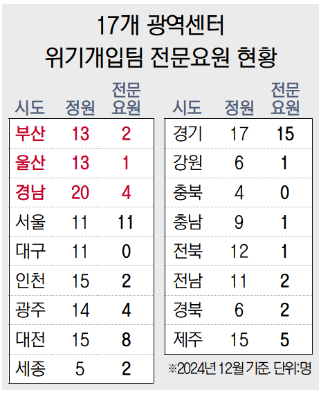 14일 〈부산일보〉가 국회 보건복지위원회 김미애 의원실을 통해 보건복지부로부터 제출받은 ‘전국 위기개입팀 종사자 현황’에 따르면, 2024년 12월 기준 24개 광역정신건강복지센터 요원 중 정신건강전문요원 자격 보유자는 61명으로 전체 197명의 31%에 불과하다. 정신건강전문요원은 관련 분야 전문지식을 갖추고 수련기관을 거쳐 보건복지부장관에게 자격을 인정받은 인력으로, 전문성에 따라 임상심리사, 간호사, 사회복지사, 작업치료사 등으로 구분된다.
