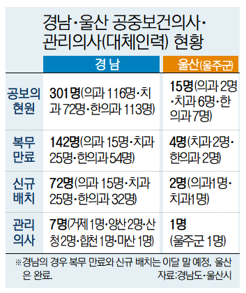 울산에서 유일하게 공보의가 배정되는 울주군에서는 현재 근무 중인 공보의 15명 중 일반 진료가 가능한 의과 전공은 단 2명뿐이며, 이들마저 내년 4월 복무 만료를 앞두고 있어 충원되지 않을 경우 일선 보건지소 운영 중단이 불가피하다.