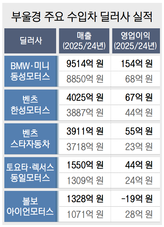 지난해 부울경 수입차 딜러들 가운데 BMW·미니 딜러인 동성모터스가 최대 영업이익을 올리고 기부금도 가장 많이 내며 지역 내 최대 수입차 딜러로서의 위상을 다시 한 번 각인시켰다. 메르세데스-벤츠의 공식 파트너사인 한성모터스와 스타자동차도 영업이익이 대폭 증가했다. 볼보 아이언모터스는 적자 전환했다.