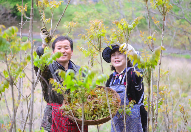 23일 지리산 자락인 경남 함양군 마천면 의중마을에서 장철안 씨 부부가 옻순을 따고 있다. 옻순은 향이 끊이지 않고 감칠맛을 가지고 있서 봄나물의 여왕으로 평가받는다. 함양군 제공