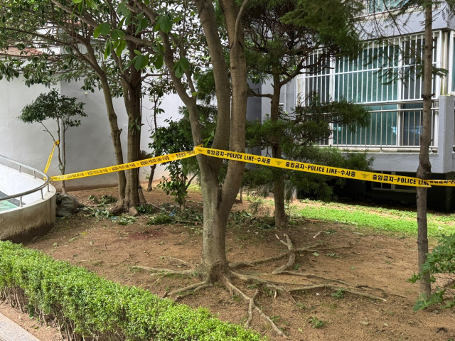 21일 오전 1시 39분께 부산 해운대구의 한 아파트 화단에서 고교생 3명이 숨진 채 발견됐다. 폴리스라인이 설치된 해당 아파트 화단.