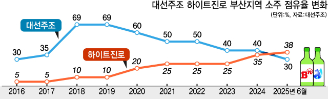 10일 주류업계에 따르면 부산 지역 소주인 대선주조의 올해 1~6월까지 부산 소주 시장 점유율은 30%다. 반면 전국구 소주인 하이트진로의 시장 점유율은 38%를 기록하며 1위를 차지했다. 지난해 부산 소주 시장은 대선주조가 40%, 하이트진로가 35%를 차지했다.