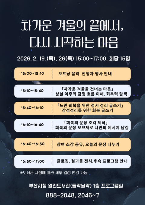 김귀옥 시 청년산학국장은 “이번 행사가 시민들이 차가운 겨울의 끝자락에서 잠시 멈춰 서서 삶을 돌아보는 계기가 되길 바란다”라며 “상실의 시간을 지나 새로운 시작을 준비하는 따뜻한 공감의 자리가 되길 희망한다”라고 전했다.