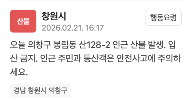 창원소방본부와 경찰 등에 따르면 이날 오후 3시 52분께 창원시 의창구 봉림동 한 야산에서 불이 나 약 1시간 만에 주불이 잡혔다. 산불 당시 주변에 연기가 크게 일면서 창원소방본부에 116건의 관련 신고가 들어왔다. 인명피해는 없는 것으로 파악됐다. 산불 초기 야산 인근 아파트 등으로 불이 확산할 것으로 우려되자 소방 당국은 이날 오후 4시 15분께 관할 소방서 인력 전체가 출동하는 '대응 1단계'를 발령했다.
