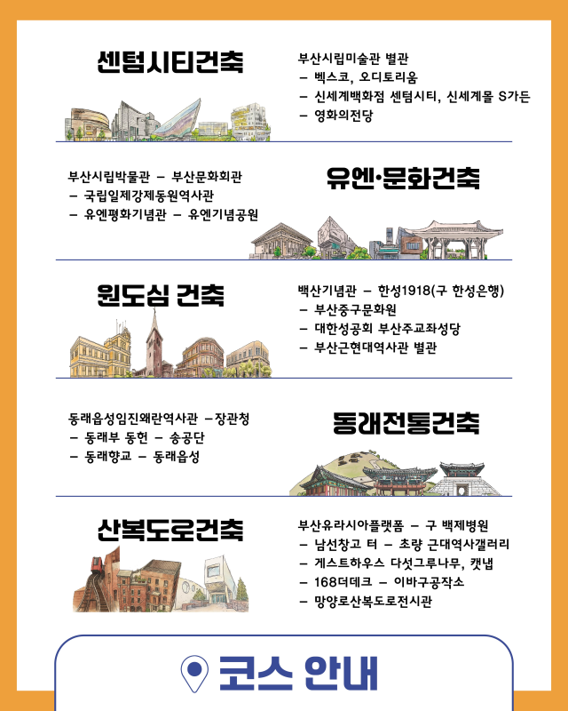 건축투어는 부산의 대표적인 도시·건축문화자산으로 구성된 △센텀시티건축(해운대구) △유엔·문화건축(남구) △원도심건축(중구) △동래전통건축(동래구) 코스가 있으며, 작년 5월 새롭게 선보인 △산복도로건축(동구)까지 더해 총 5개 코스를 운영한다.