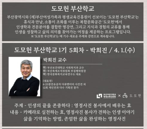 부산 지역 성인학습를 위해 (재)부산여성가족과 평생교육진흥원이 진행하는 도모헌 부산학교에서 삶의 마지막을 주제로 한 의미 있는 강의가 지난 1일 열렸다.